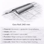 Geo Roll 240 mm is a ridge ventilation and sealing tape used at roof ridges and hips to protect roofing assemblies from moisture, snow, and dust infiltration. It combines a durable aluminum strip with geotextile and self-adhesive butyl tape to form a lightweight, breathable ridge tape that conforms to metal roofing profiles and provides continuous ventilation while sealing against weather penetration.